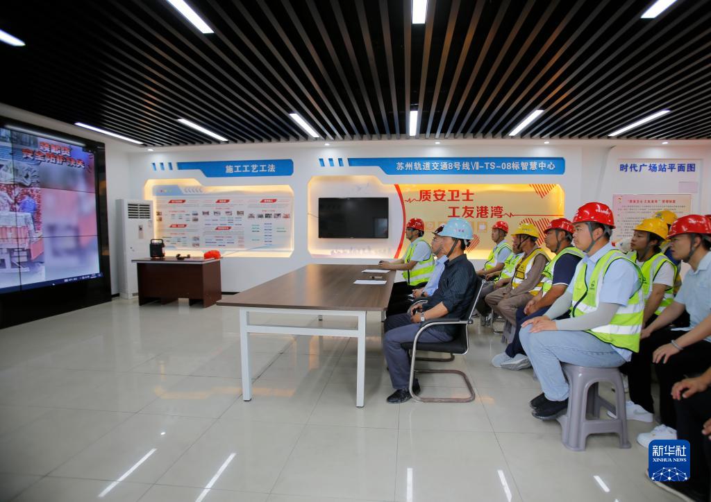 6月7日,在蘇州軌道交通8號線(xiàn)時(shí)代廣場(chǎng)站建設工地,建筑工人參加安全生產(chǎn)警示教育活動(dòng)。