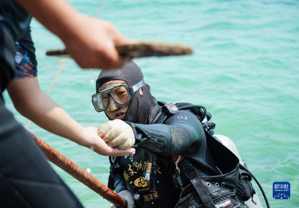海南省三亞蜈支洲島海域海洋牧場(chǎng)是海南首個(gè)國家級海洋牧場(chǎng)示范區,蜈支洲島旅游區海洋部經(jīng)理王豐國作為海洋牧場(chǎng)建設的一線(xiàn)作業(yè)人員,致力于海域生態(tài)環(huán)境的修復和保護。他與海為伴,完成人工魚(yú)礁、船礁投放,珊瑚移植,協(xié)助科研機構調研等工作?!拔覀円彩撬虑宓婪颉?,清理海洋垃圾和珊瑚敵害,也是王豐國的日常工作。