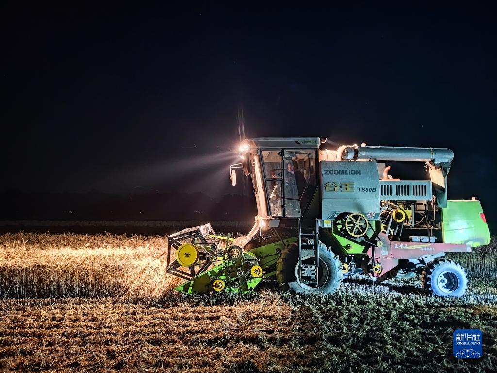 6月6日晚,在山東省菏澤市曹縣的一處麥田,農機手駕駛收割機收割小麥。