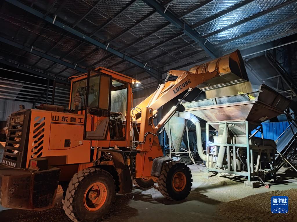 6月6日晚,在山東省菏澤市曹縣王集鎮小麥烘干加工合作社內,鏟車(chē)將濕麥倒入烘干機入料口 。