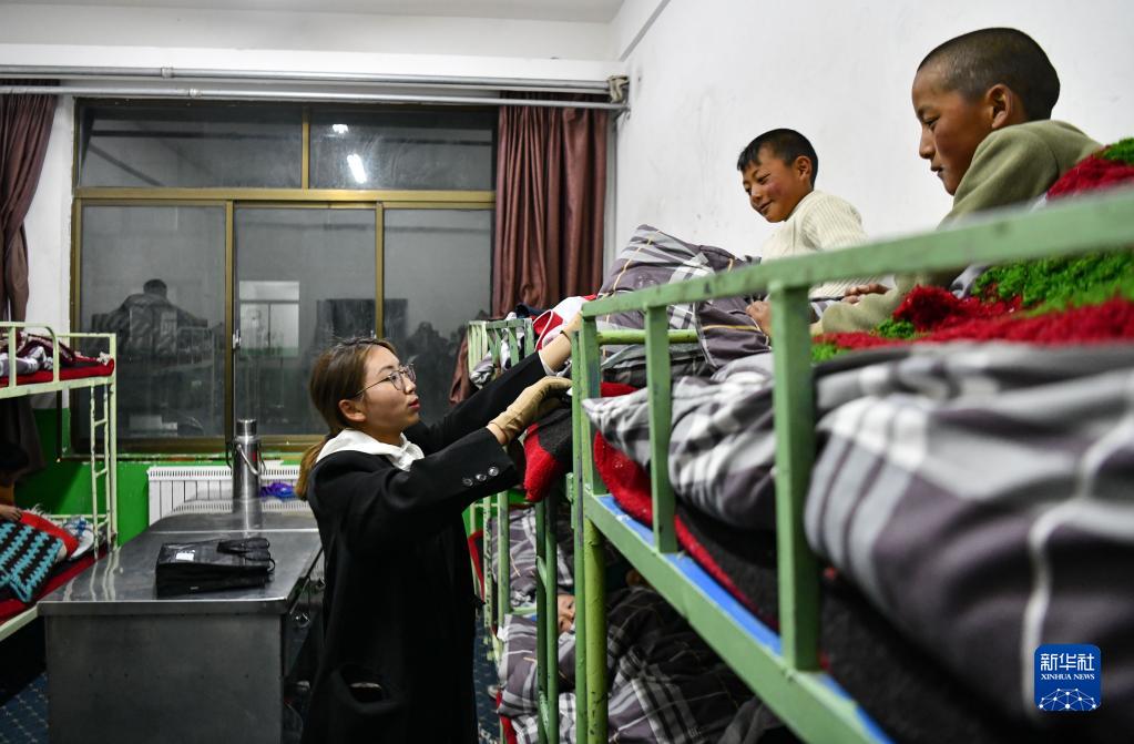 扎西宗鄉完全小學(xué)的值班老師在檢查孩子睡覺(jué)時(shí)是否蓋好被子(6月5日攝)。新華社記者 晉美多吉 攝