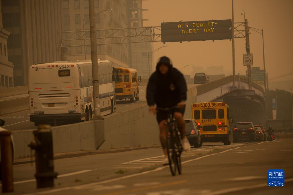 6月7日,一名市民騎自行車(chē)經(jīng)過(guò)美國紐約一個(gè)空氣質(zhì)量警報顯示牌。
