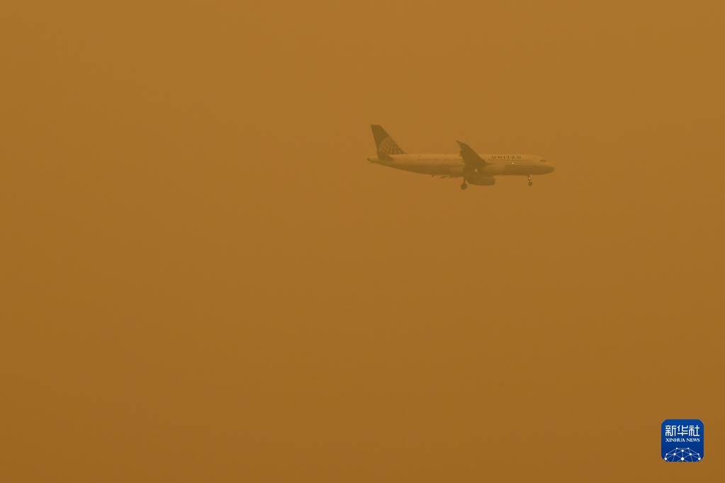 6月7日,一架飛機從煙塵籠罩的美國紐約上空飛過(guò)。
