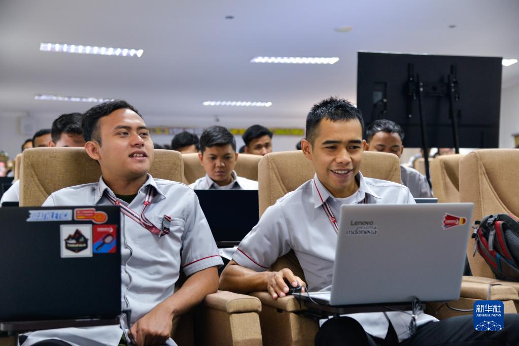 6月7日,在位于印度尼西亞茉莉芬市的印尼鐵路理工學(xué)院,學(xué)員在雅萬(wàn)高鐵動(dòng)車(chē)組機械師培訓班上與翻譯老師互動(dòng)。
