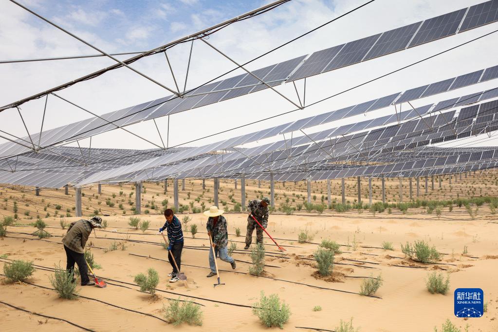 6月1日,工人在武威市涼州區九墩灘光伏治沙示范園區管護噴灌管道。