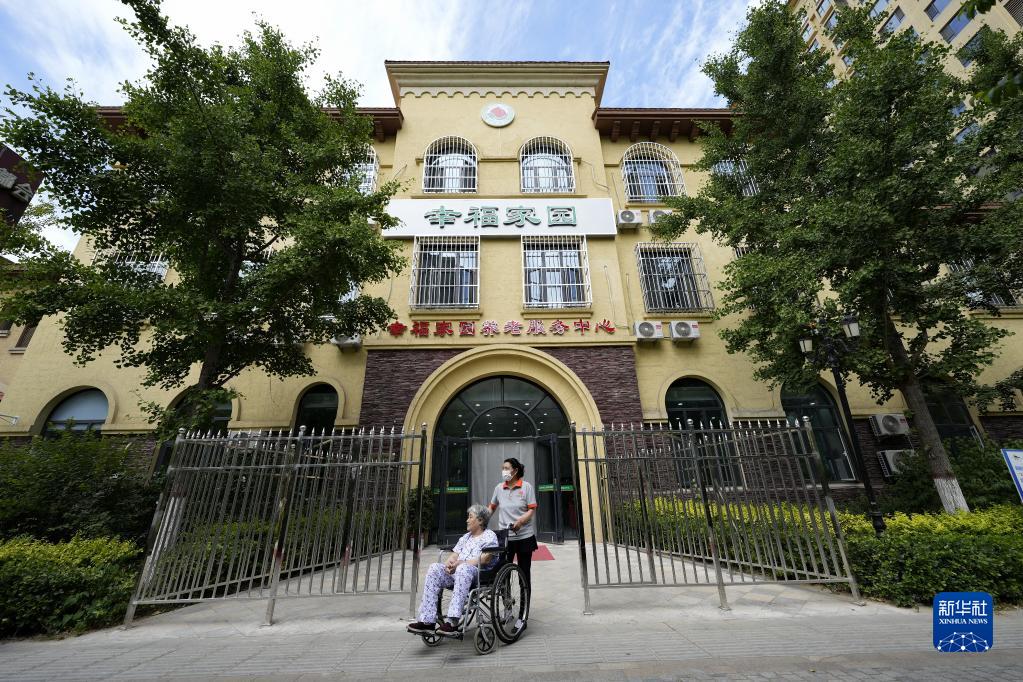 6月8日,河北省灤州市灤城街道東南都會(huì )社區一家社區養老中心的工作人員帶領(lǐng)行動(dòng)不便的老人在社區內休閑。
