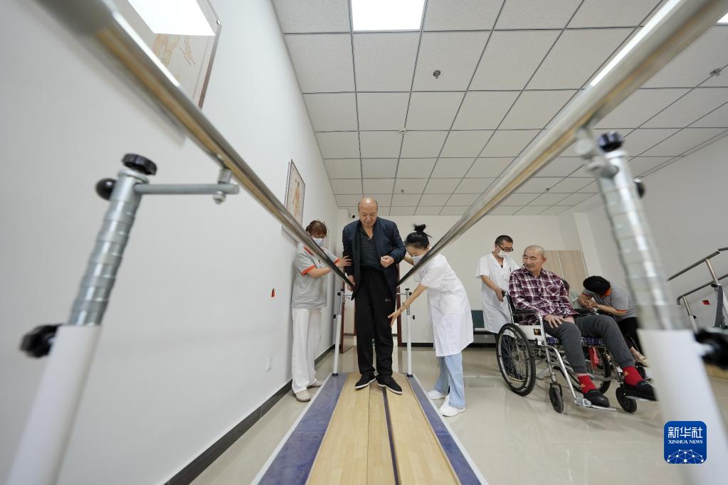 6月8日,河北省灤州市灤城街道東南都會(huì )社區一家社區養老中心的工作人員在幫助老人進(jìn)行康復訓練。