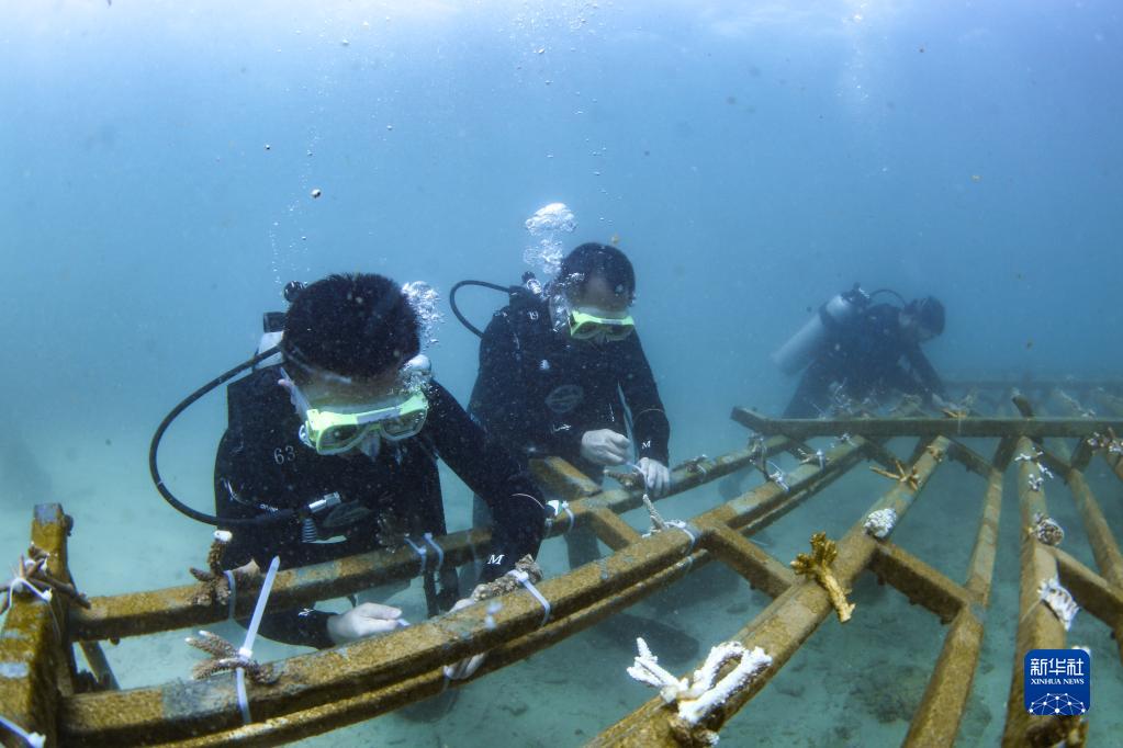 6月8日,海南省海洋與漁業(yè)科學(xué)研究院的專(zhuān)家和潛水員在海南陵水分界洲島附近海域移植珊瑚。