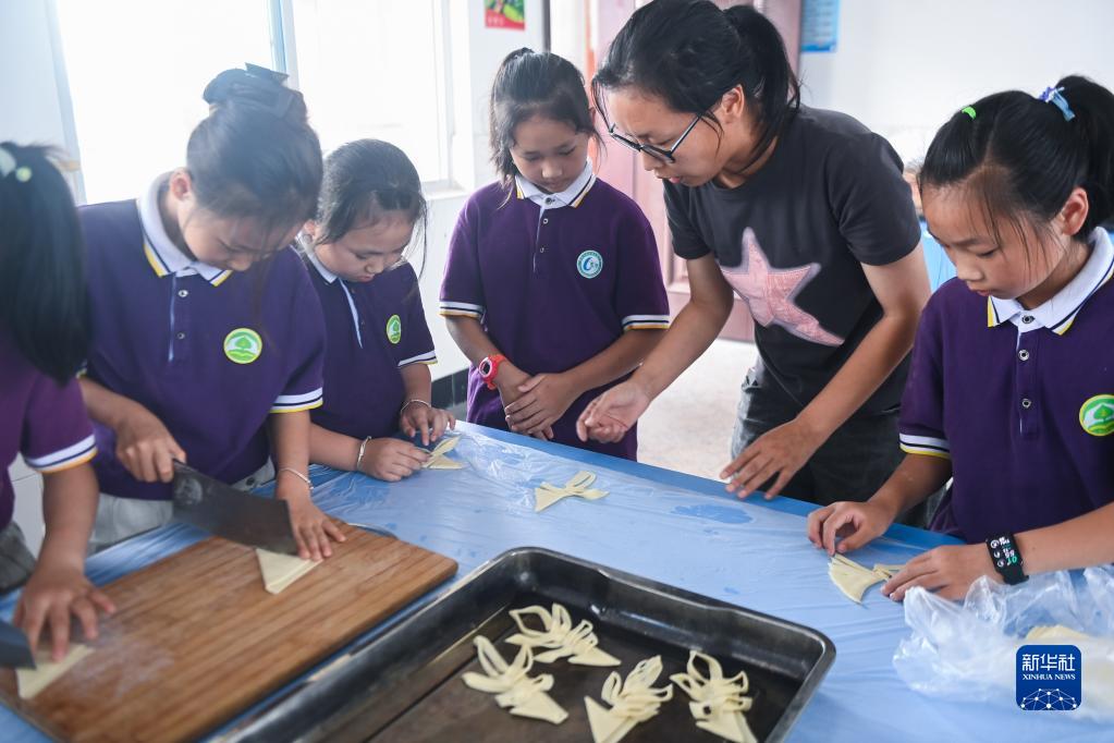 6月8日,學(xué)生們在傳統習俗課上學(xué)習做當地特色美食——麥花。
