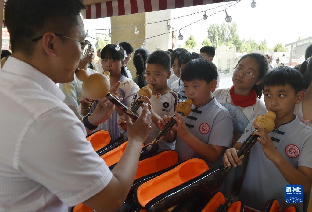 6月8日,學(xué)生們在活動(dòng)現場(chǎng)體驗吹奏葫蘆絲。