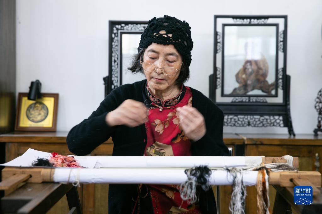 在重慶市渝中區的重慶渝康寧蜀繡藝術(shù)研究院,康寧在制作蜀繡作品(5月12日攝)。