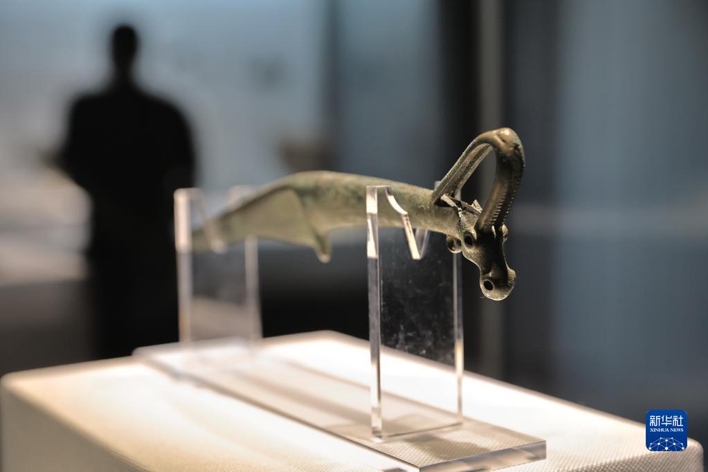 6月9日在“鄂爾多斯青銅器文物精品展”拍攝的展品“羊首青銅刀”。