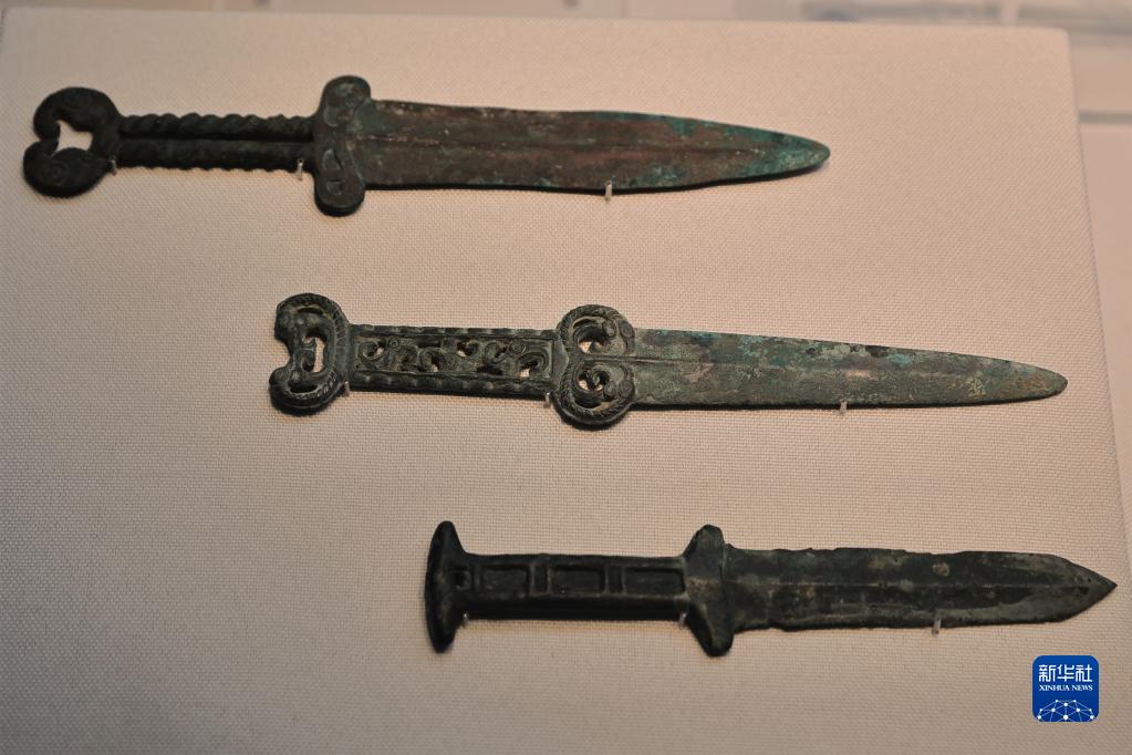 6月9日在“鄂爾多斯青銅器文物精品展”拍攝的青銅短劍。