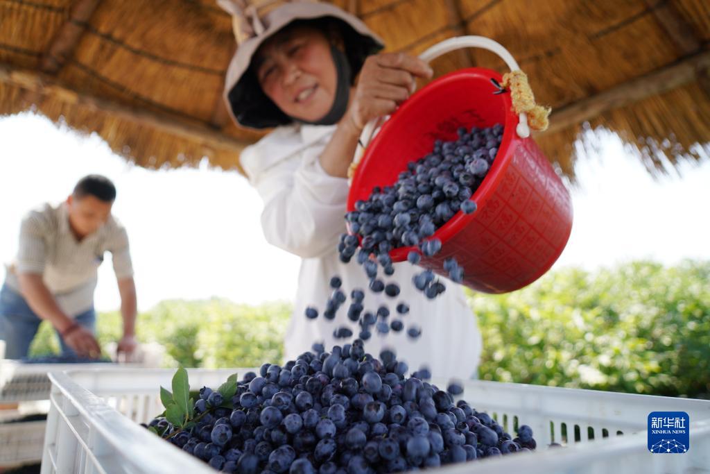 6月9日,村民在山東省臨沂市沂南縣蘇村鎮藍莓園裝運藍莓。