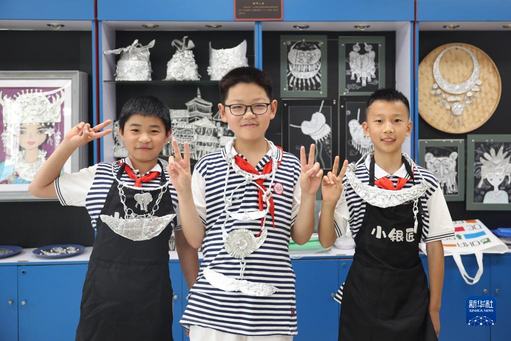 6月9日,湖南省長(cháng)沙市朝陽(yáng)小學(xué)學(xué)生們在特色美育課上展示有苗族銀飾特色的手工作品。
