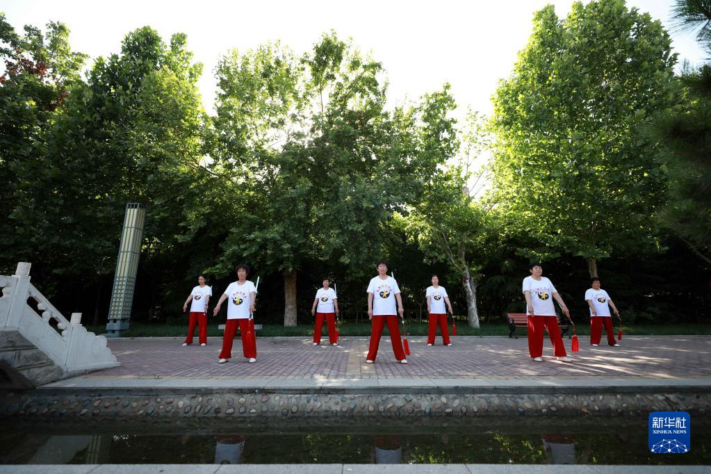 6月9日,太極拳愛(ài)好者在河北省邢臺市任澤區人民廣場(chǎng)展示王其和太極拳器械太極劍。