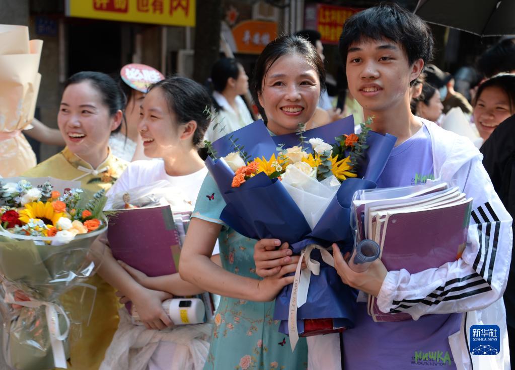 6月9日下午,在長(cháng)沙市麓山國際實(shí)驗學(xué)??键c(diǎn),結束考試的考生與家長(cháng)合影留念。
