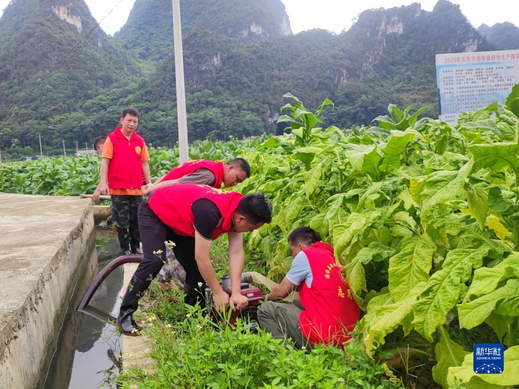 6月6日,廣西德??h燕峒鄉黨員先鋒隊在太平煙葉基地抽水澆灌煙田。