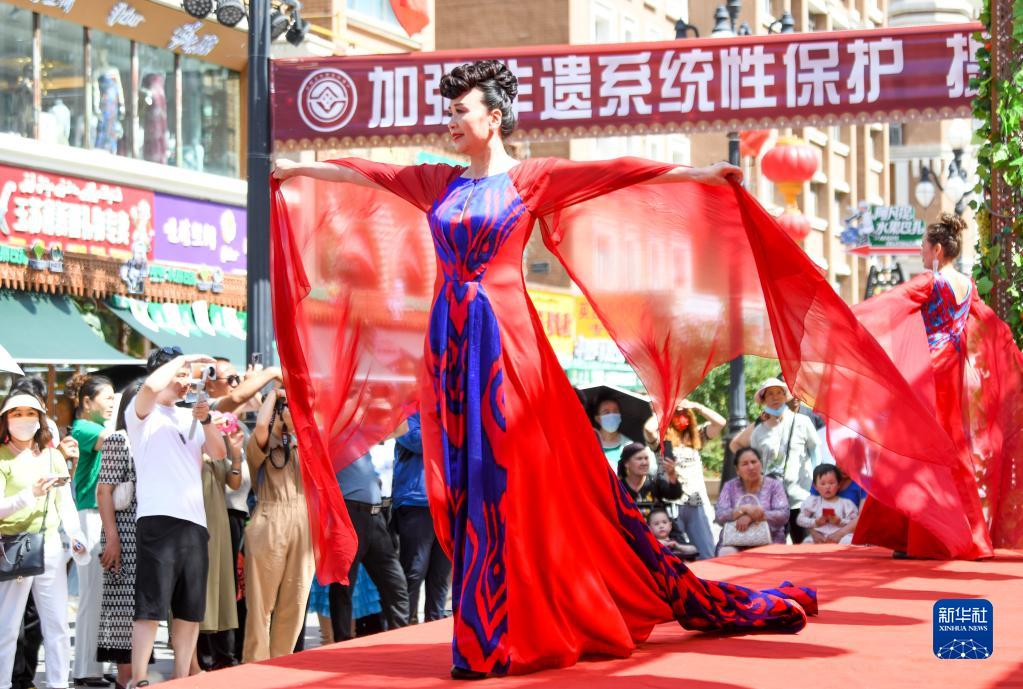 6月9日,在烏魯木齊大巴扎景區,模特在活動(dòng)現場(chǎng)展示艾德萊斯綢制作的時(shí)裝。