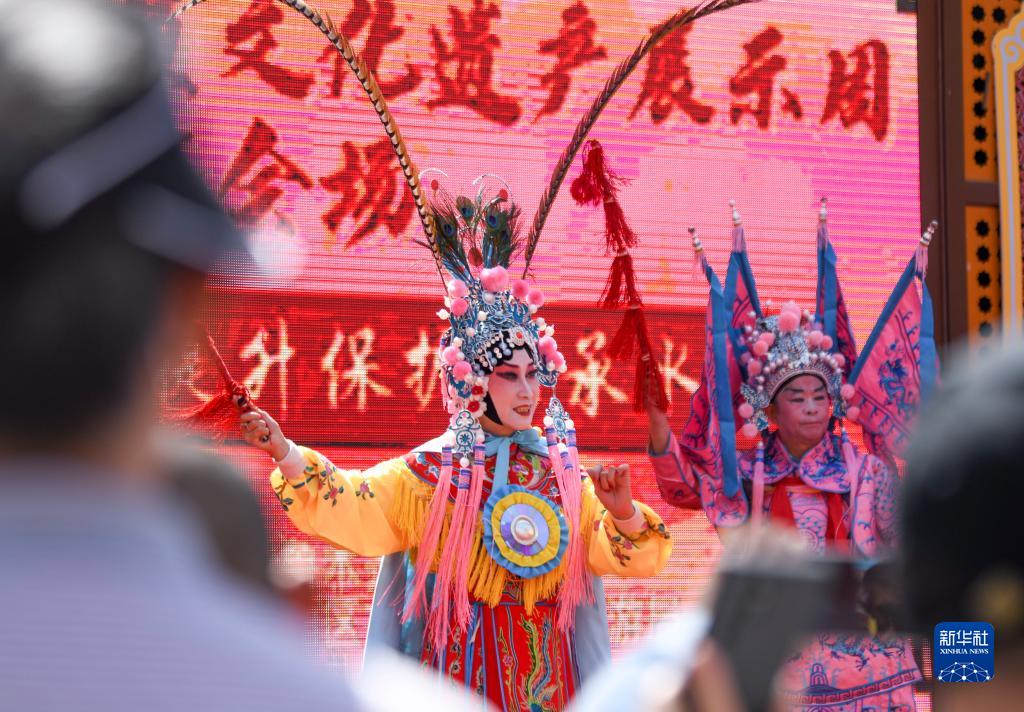 6月9日,在烏魯木齊大巴扎景區,烏魯木齊市文化館群星京劇團的演員表演京劇《國粹芬芳》。