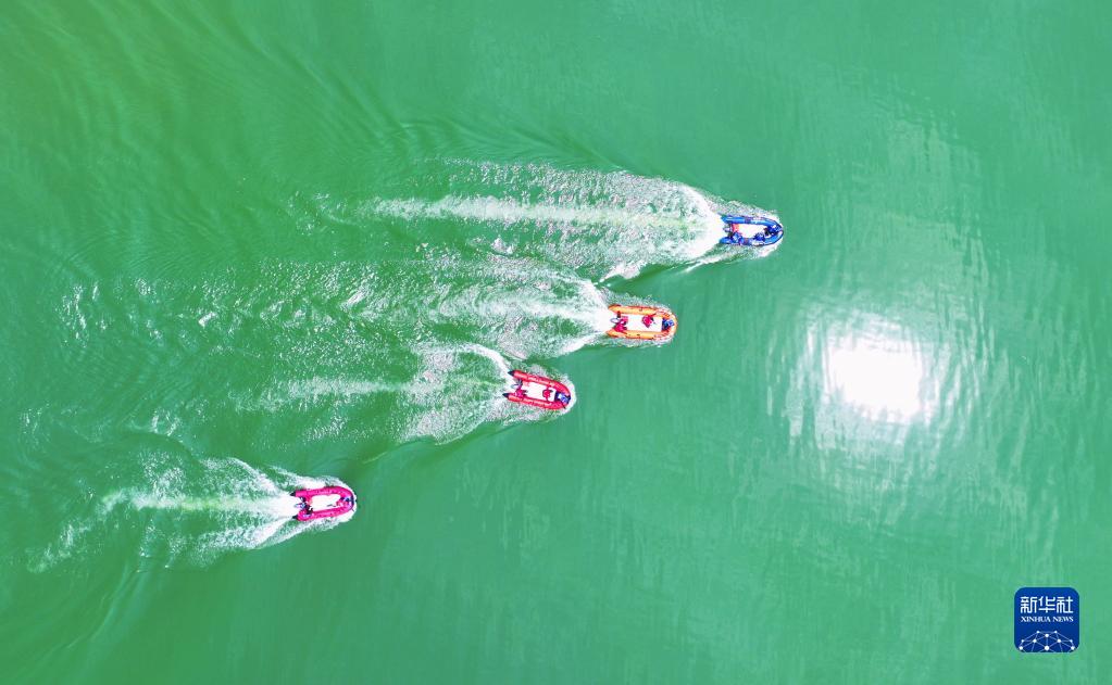 6月9日,在浙江省湖州市長(cháng)興縣合溪水庫煤山段,應急救援隊進(jìn)行沖鋒舟編隊演練(無(wú)人機照片)。