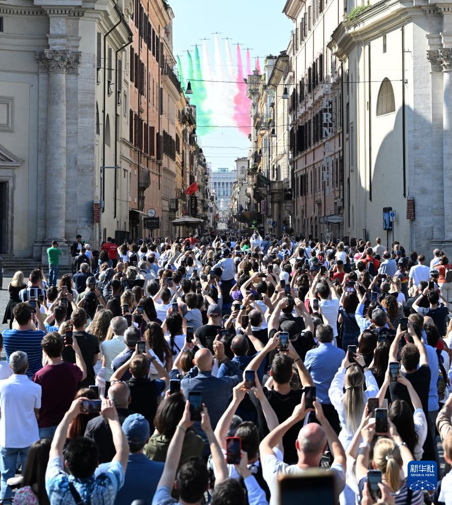 6月2日,在意大利羅馬,人們拍攝共和國日慶祝儀式上的意大利“三色箭”特技飛行表演隊表演。