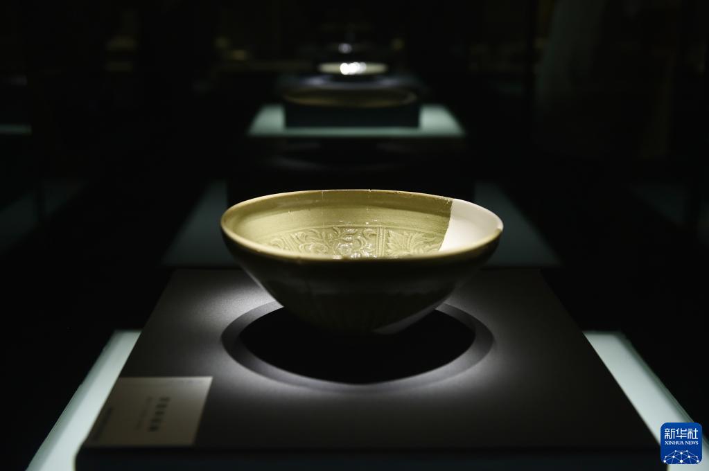 這是6月10日在鄭州大象陶瓷博物館拍攝的展品青瓷印花碗。