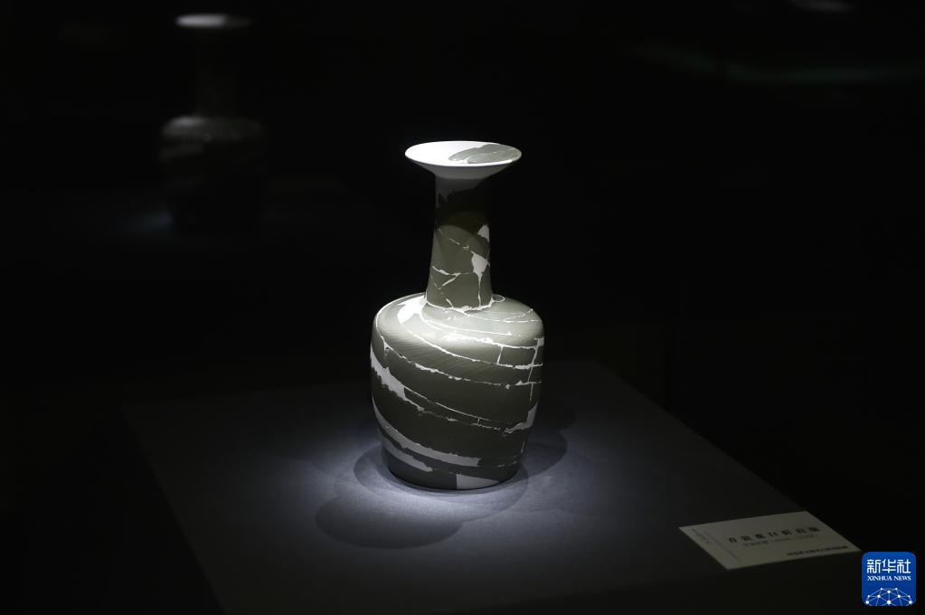 這是6月10日在鄭州大象陶瓷博物館拍攝的展品青瓷盤(pán)口折肩瓶。
