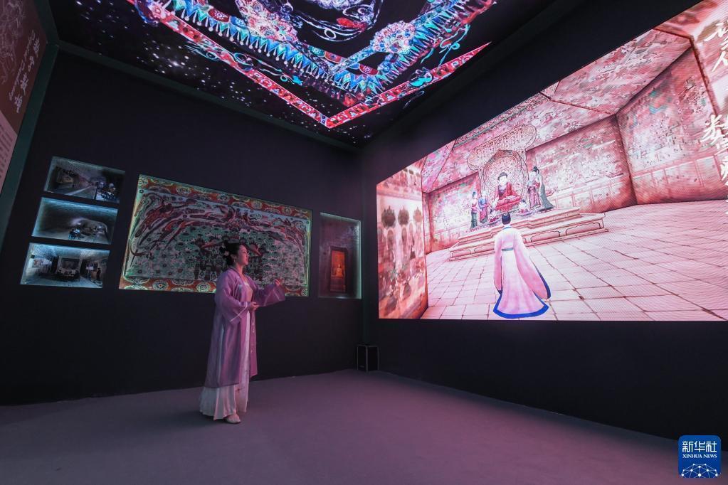 6月8日,在“文旅消費館·一帶一路國際館”甘肅展臺,一位身著(zhù)古裝的觀(guān)眾在觀(guān)看數字敦煌展覽。