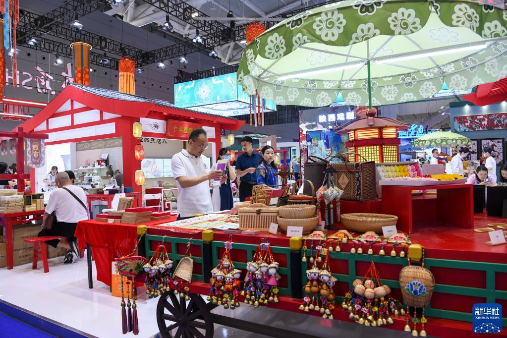 6月9日,在文博會(huì )“文旅消費館·一帶一路國際館”陜西展臺,觀(guān)眾瀏覽選購特色商品。