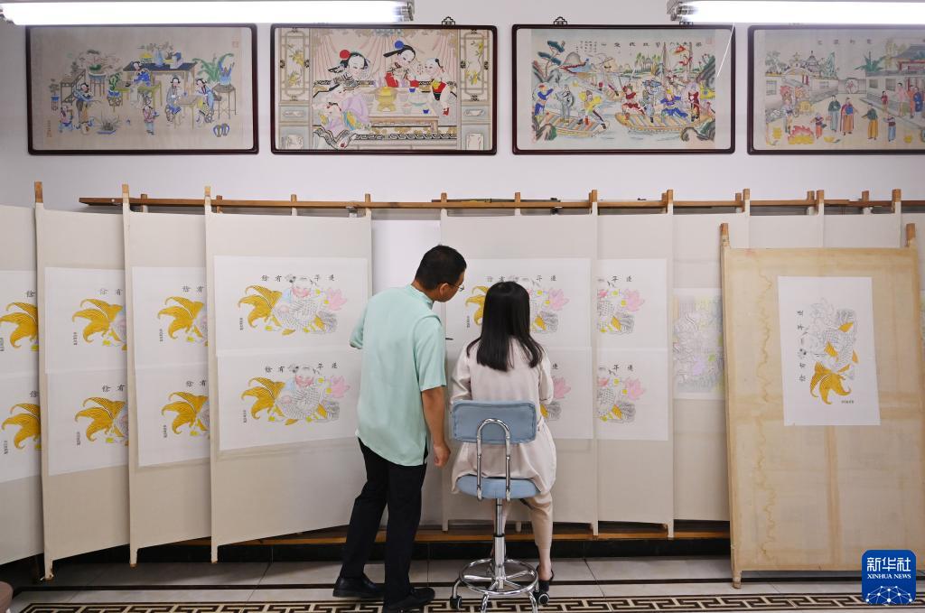 多年來(lái),為了更好地保護傳承楊柳青木版年畫(huà),霍樹(shù)林和父親將散落在各地的古版、畫(huà)稿搜集起來(lái),籌建起一座年畫(huà)博物館,不同時(shí)期、風(fēng)格各異的年畫(huà)古版有上百塊?;魳?shù)林說(shuō):“得讓年畫(huà)從墻上‘走下來(lái)’,吸引更多年輕人的目光?!比缃?,他和同為傳承人的妻子王丹一起將年畫(huà)元素與現代文創(chuàng )相結合,設計出的團扇、宮燈、撲克等產(chǎn)品,深受年輕消費者喜愛(ài)。