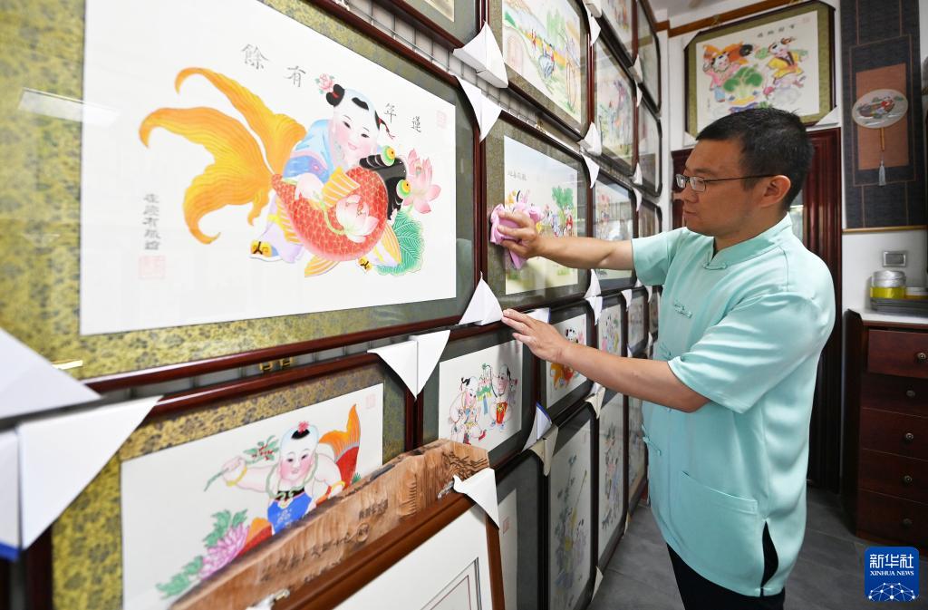 在天津市西青區的楊柳青霍氏古一張畫(huà)店,霍樹(shù)林在用布擦拭畫(huà)框(6月6日攝)。