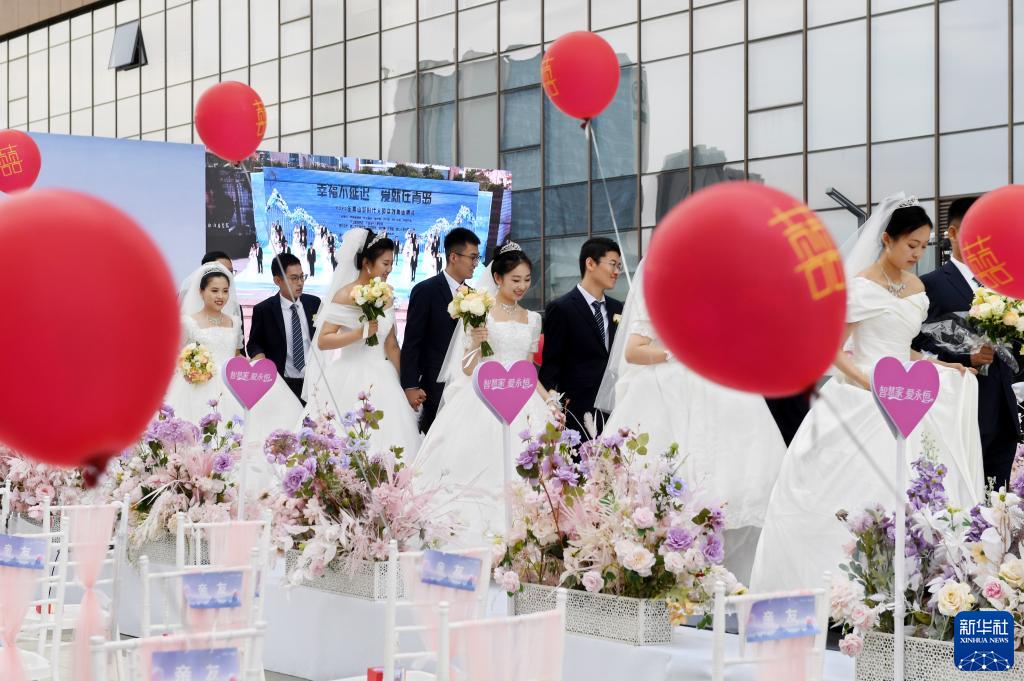 6月10日,新人們在青島市嶗山區海爾科創(chuàng )生態(tài)園新時(shí)代文明實(shí)踐廣場(chǎng)參加集體婚禮。