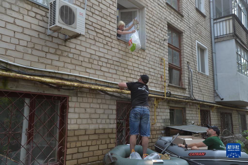 6月9日,志愿者向被洪水圍困的赫爾松市民運送生活物資。