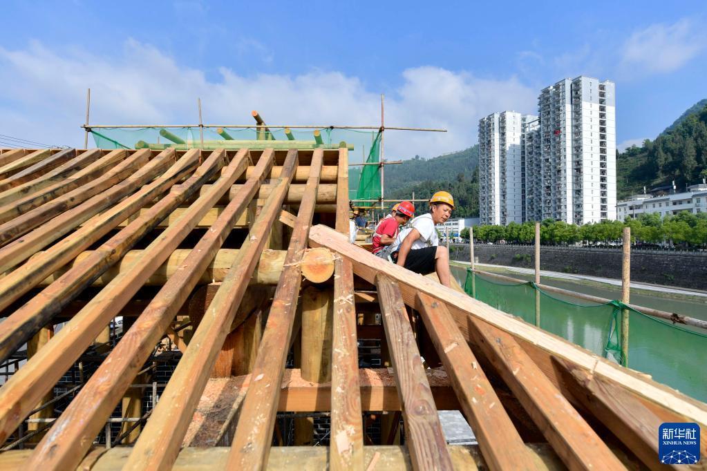 6月10日,木匠在湖北省宣恩縣城仙山貢水旅游區修建景觀(guān)吊腳樓。