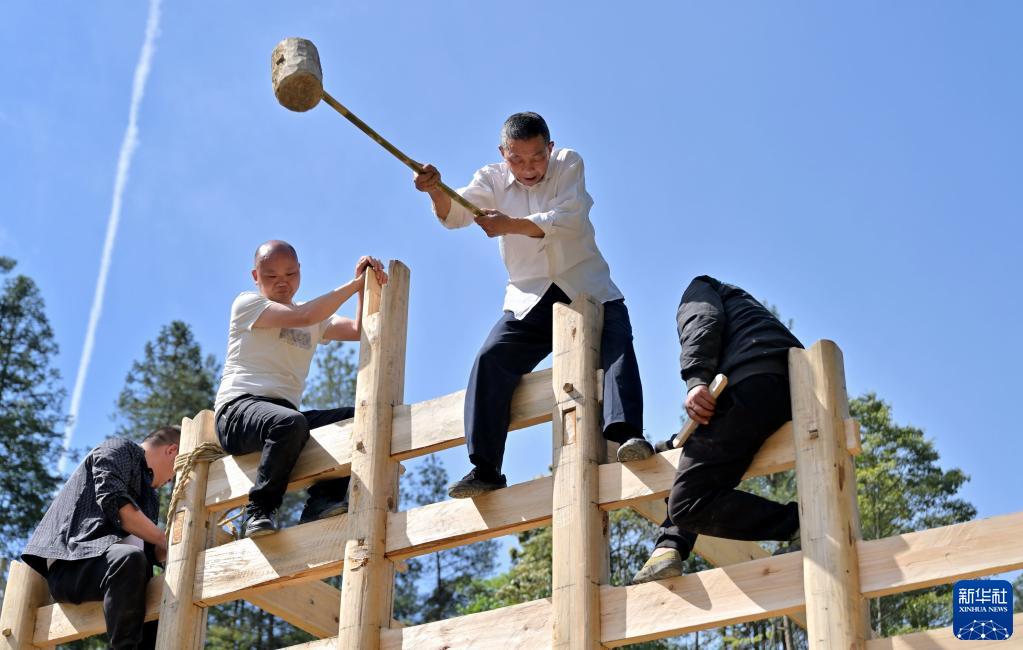 4月26日,在湖北省宣恩縣沙道溝鎮老岔村,村民在修建吊腳樓。