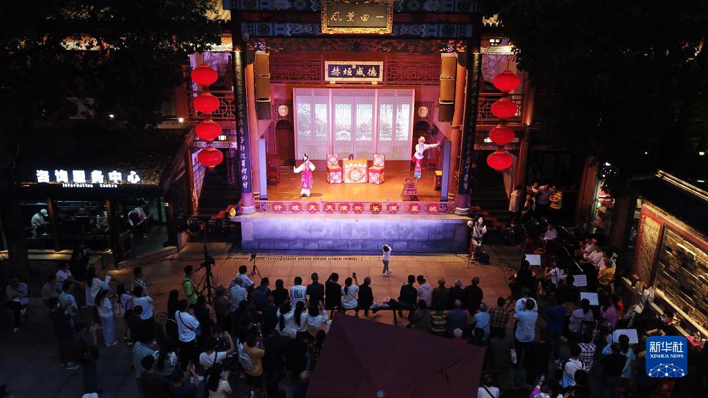 6月5日,長(cháng)沙市花鼓戲保護傳承中心的演員在長(cháng)沙市坡子街火宮殿演出(無(wú)人機照片)。