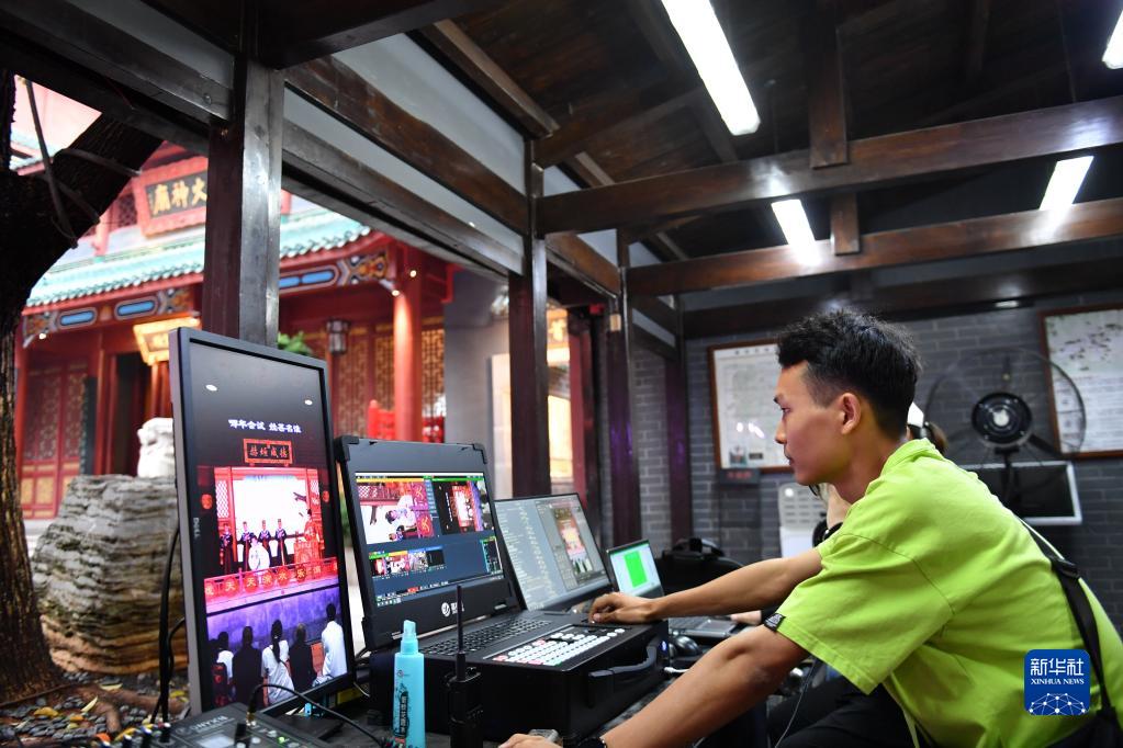 6月5日,在長(cháng)沙市坡子街火宮殿,長(cháng)沙市花鼓戲保護傳承中心的直播團隊在操作導播臺。