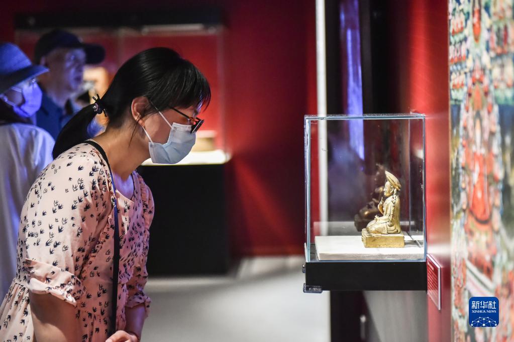 6月10日,2023“文化和自然遺產(chǎn)日”北京市主場(chǎng)活動(dòng)暨北京白塔文化周開(kāi)幕。觀(guān)眾在觀(guān)看“吉祥妙塔 寶藏重光——白塔塔藏文物展”中展出的文物。
