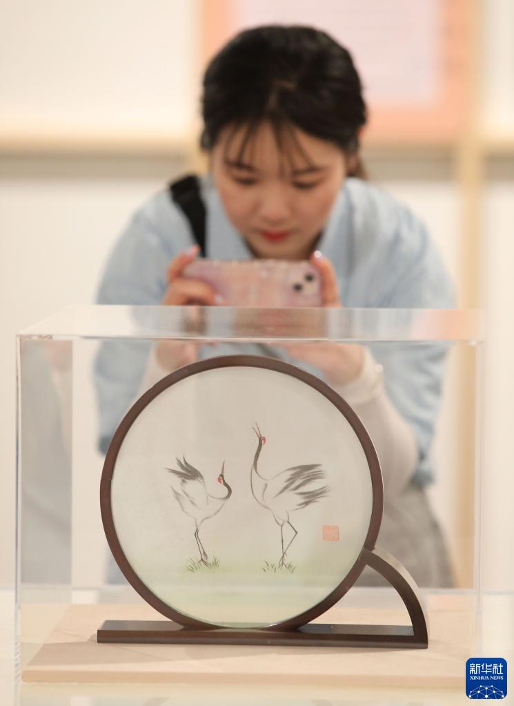 6月10日,一名市民在江蘇蘇州美術(shù)館用手機拍攝展出的非遺刺繡作品。