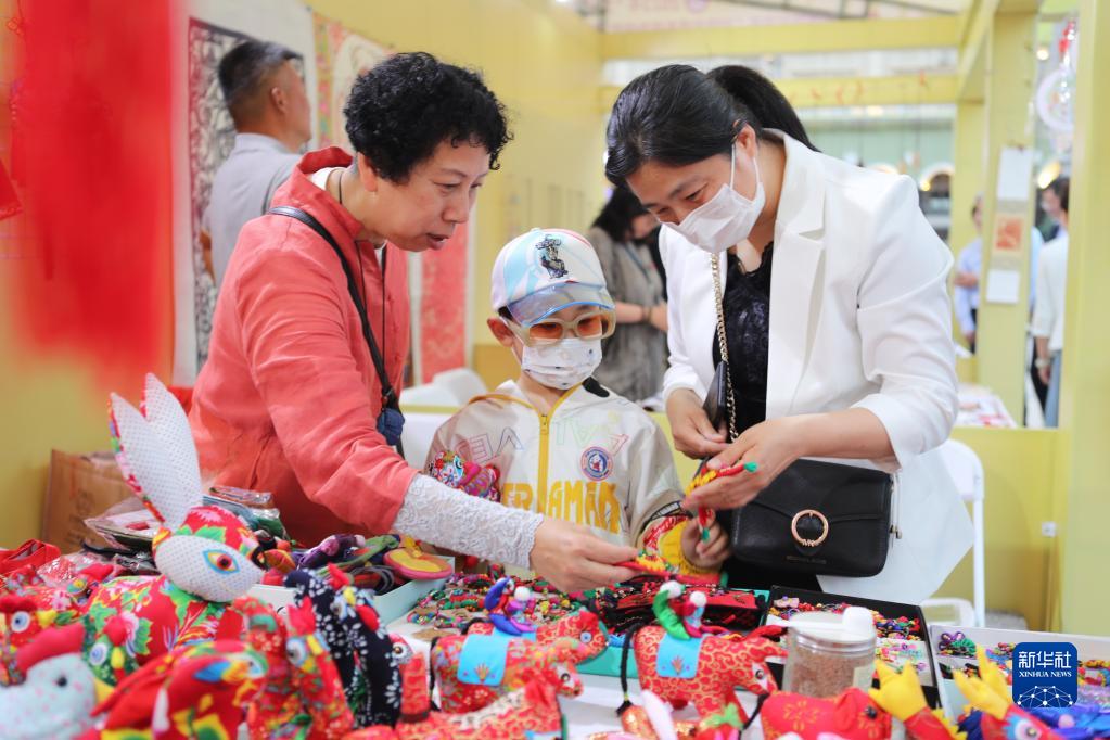 6月10日,在哈爾濱市索菲亞廣場(chǎng)非遺工坊展,市民在了解傳統手工布藝展品。