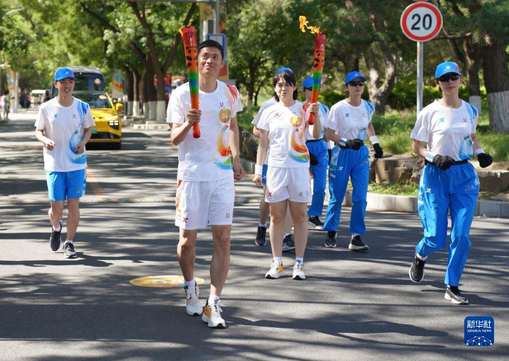 6月10日,火炬手邢衍安(左二)在火炬傳遞中。