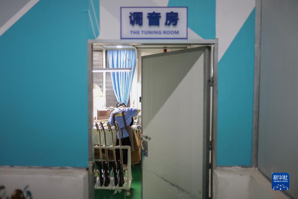 工作人員在正安吉他產(chǎn)業(yè)園內對吉他進(jìn)行調音(6月7日攝)。