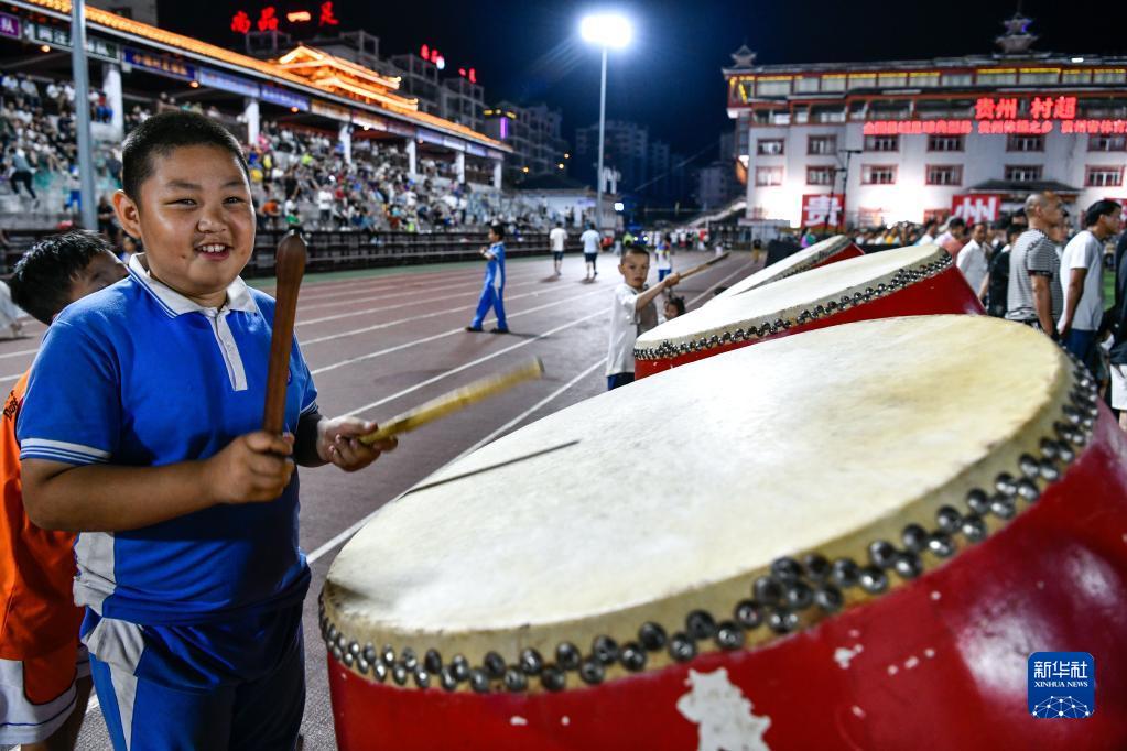 6月9日,一名小朋友在貴州“村超”足球比賽現場(chǎng)擊鼓助威。