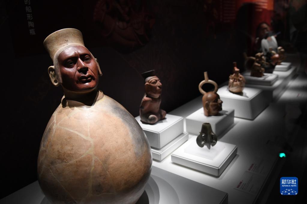 這是在陜西歷史博物館展出的秘魯文物大型人像罐(6月10日攝)。