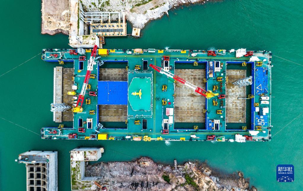 “一航津安1”號沉管運輸安裝一體船拖帶E23管節和最終接頭從珠海桂山島啟航,前往沉放水域(6月8日攝,無(wú)人機照片)。