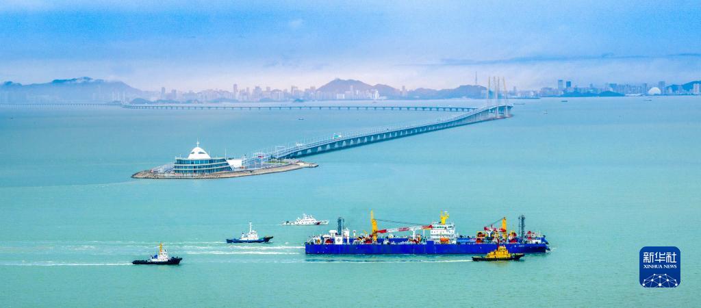 “一航津安1”號沉管運輸安裝一體船將E23管節和最終接頭浮運至安裝現場(chǎng)時(shí)經(jīng)過(guò)港珠澳大橋(6月8日攝,無(wú)人機照片)。