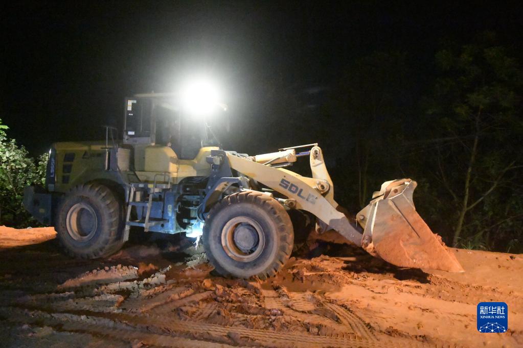 6月11日,在廣西合浦縣白沙鎮,工作人員在連夜施工修復遭受洪水損毀的堤壩。