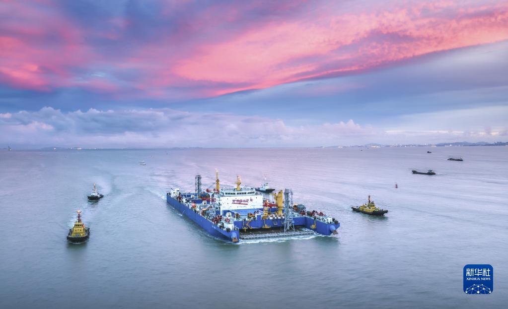 “一航津安1”號沉管運輸安裝一體船將E23管節和最終接頭浮運至安裝現場(chǎng)(無(wú)人機照片,2023年6月8日攝)。