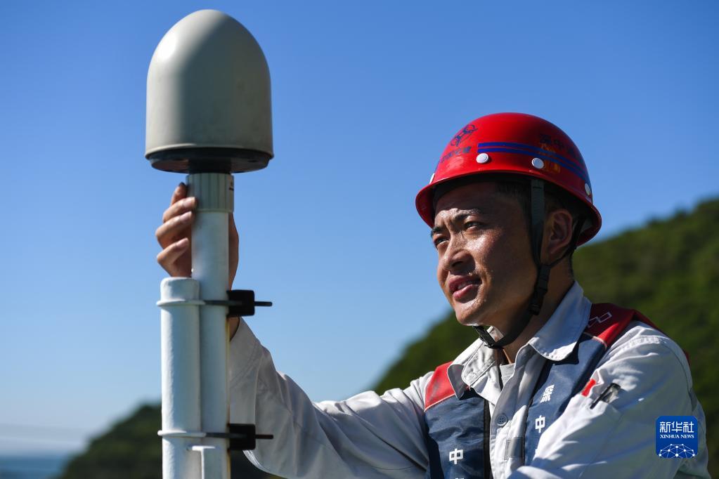 鎖旭宏檢查“一航津安1”號沉管運輸安裝一體船上的北斗衛星數據接收設備(2022年7月22日攝)。
